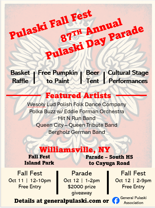 This year joining us will be the World Famous Wesoly Lud Folk Ensemble from Chicago. Following the wreath laying we will kickoff the Pulaski Fall Fest at Island Park in Williamsville, NY.