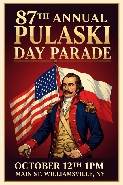 The 87th Annual Pulaski Day Parade will take place on October 12, 2025 at 1:00pm on Main Street in Williamsville. The parade will start at Williamsville South HS and end at Cayuga Road.